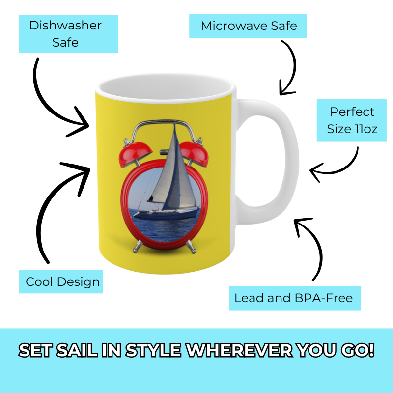 Our "It’s Sailing O'Clock" mug features a whimsical design of a sailboat in the face of a clock, reminding you that it's always time for your next adventure.