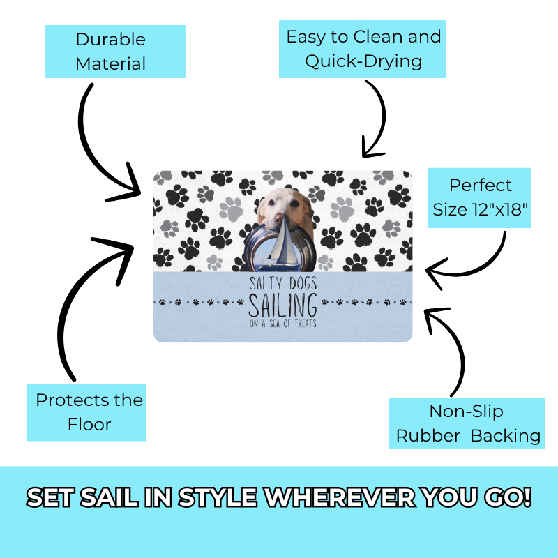 The Salty Dogs mat keeps feeding areas tidy with style!